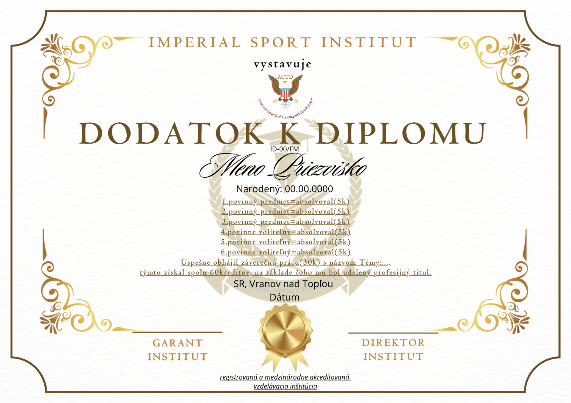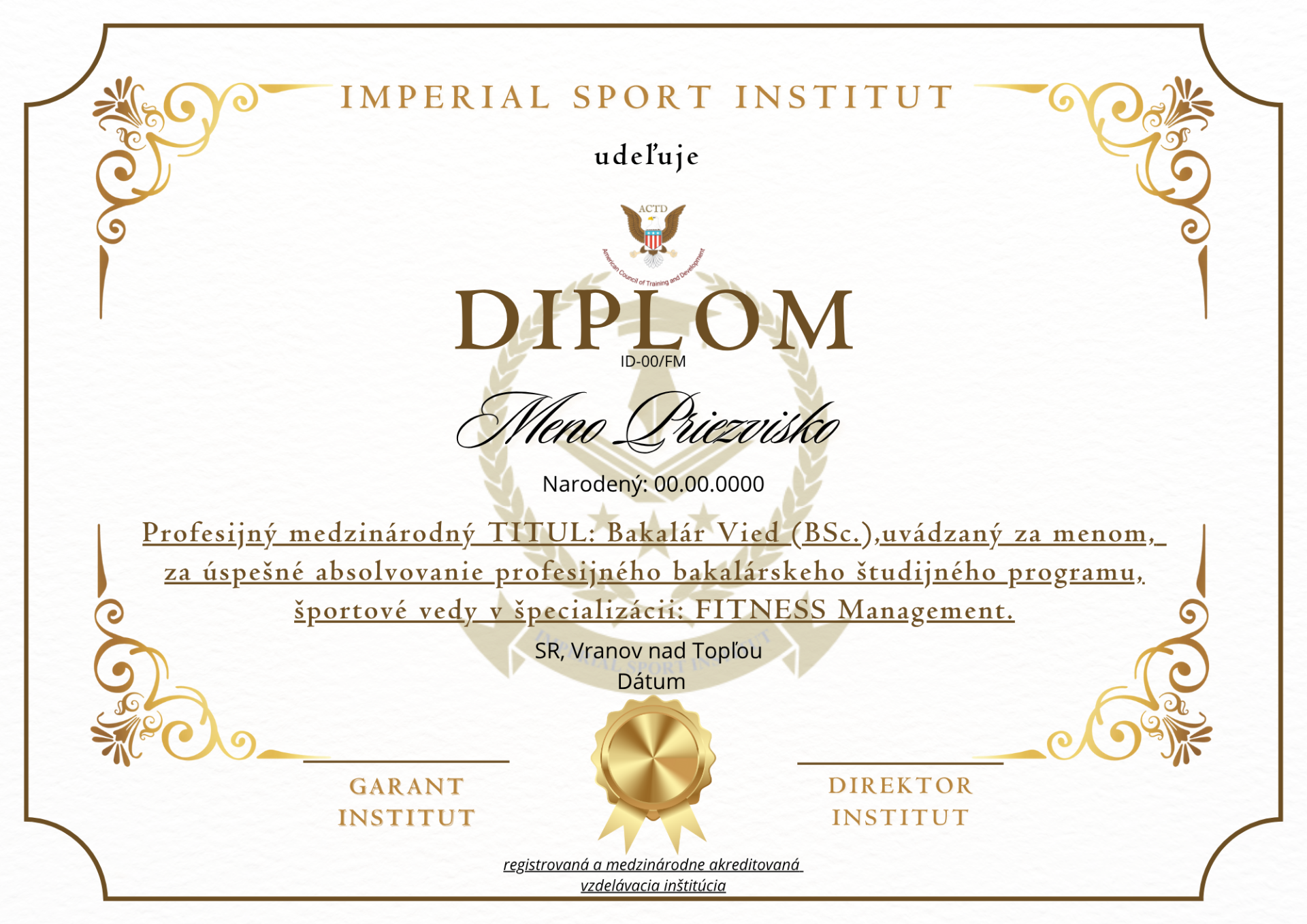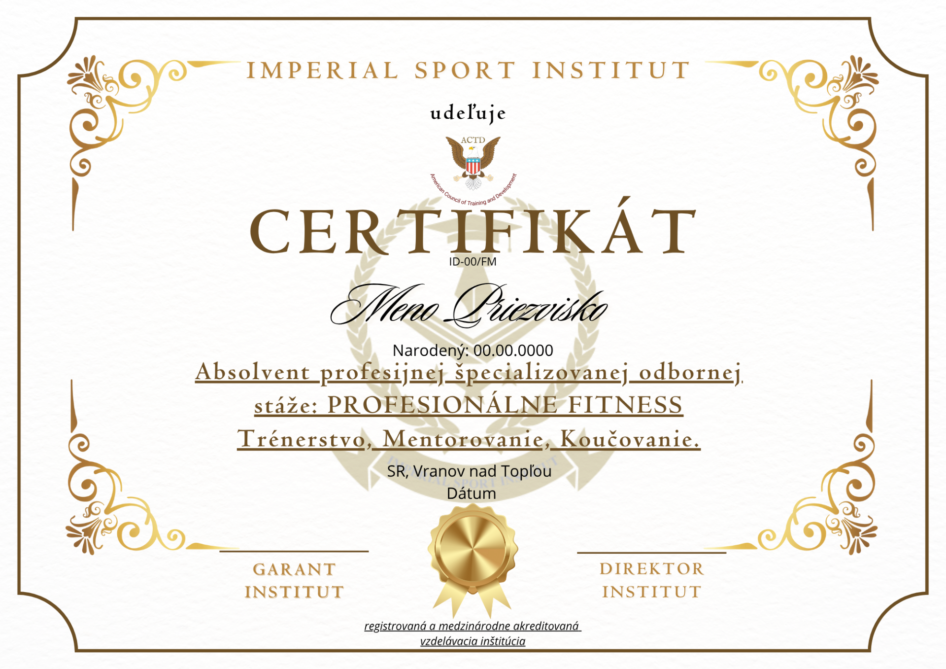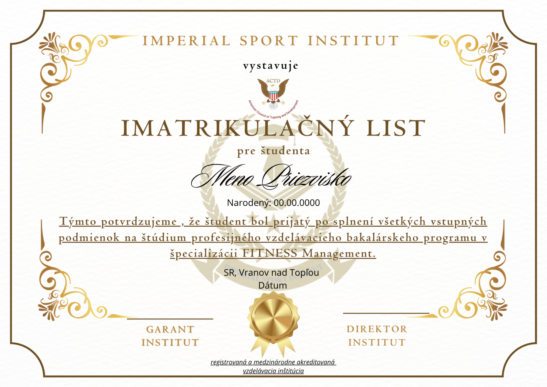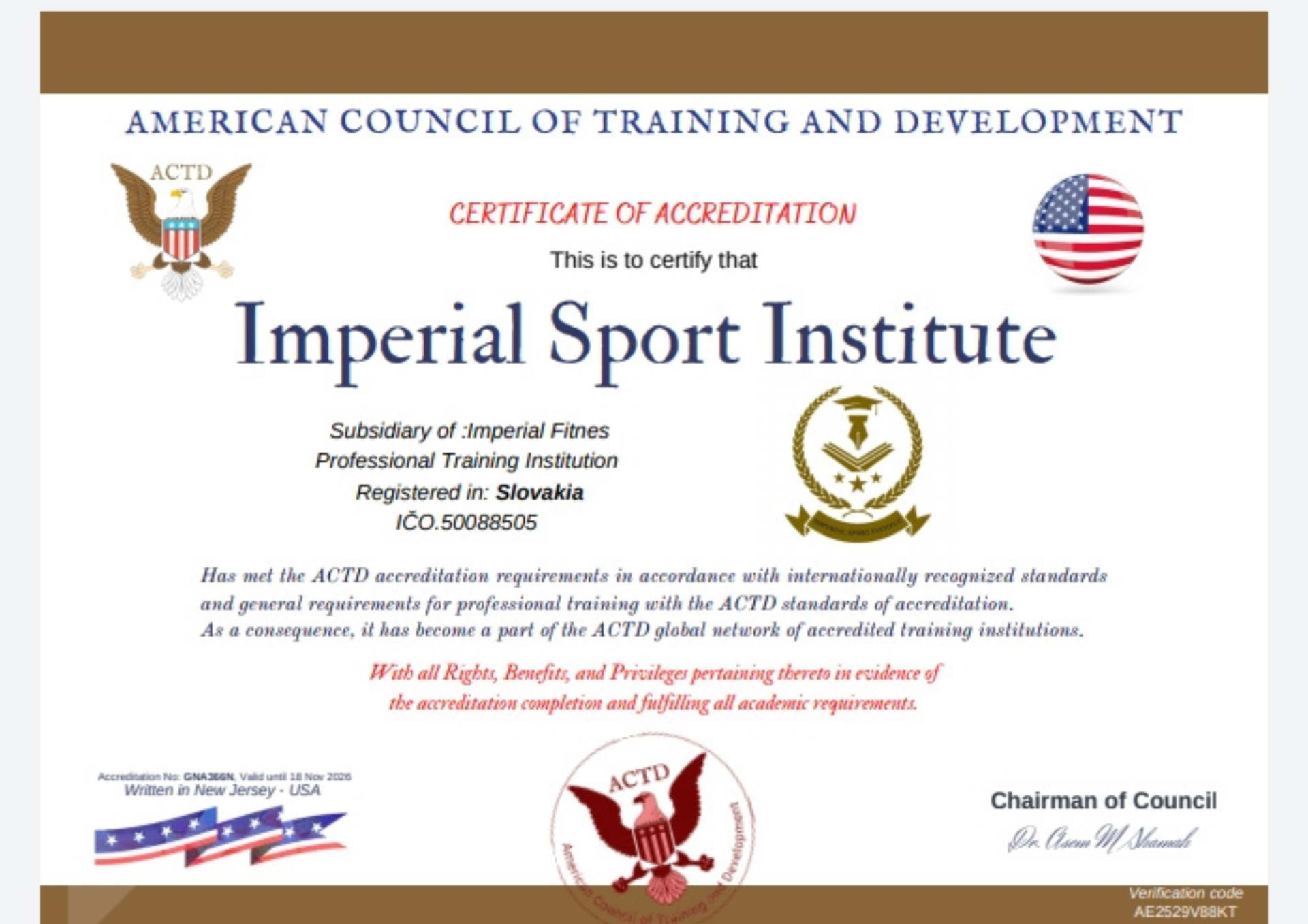 Imperial Sport Institut certifikát o akreditácii a týmto sa osvedčuje, že spĺňa požiadavky akreditácie ACTD v súlade s medzinárodne uznávanými normami a všeobecnými požiadavkami na odbornú prípravu podľa štandardov akreditácie ACTD. V dôsledku toho sa stal súčasťou globálnej siete akreditovaných vzdelávacích inštitúcií ACTD so všetkými právami, výhodami a privilégiami, ktoré k tomu patria, ako dôkaz o ukončení akreditácie a splnení všetkých akademických požiadaviek.
