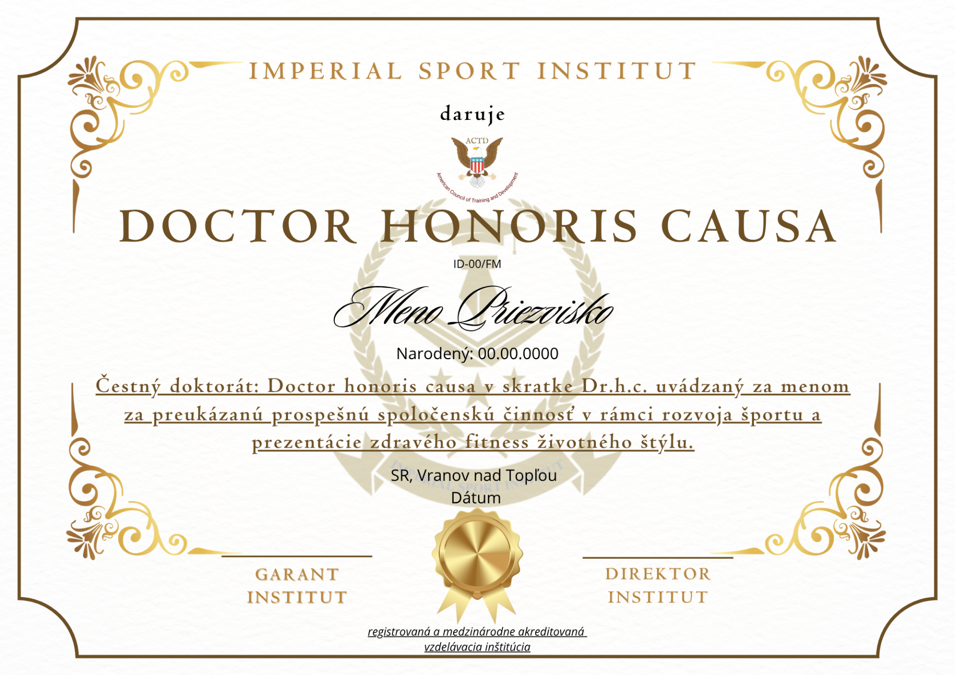 Čestný doktorát (čestný titul Dr. h.c.) sa teda často udeľuje významným osobnostiam z oblasti vedy, umenia, politiky, podnikania či verejného života, ktoré prispeli k rozvoju daného odboru, alebo spoločnosti. V rámci nášho Inštitútu môže byť takýto titul darovaný rozhodnutím rady pre vzdelávanie po splnení podmienok za rozvoj športu, respektíve za prezentáciu zdravého fitness životného štýlu, výhradne ako odmena, respektíve pamiatka, teda nie ako akademický titul udeľovaný univerzitou.